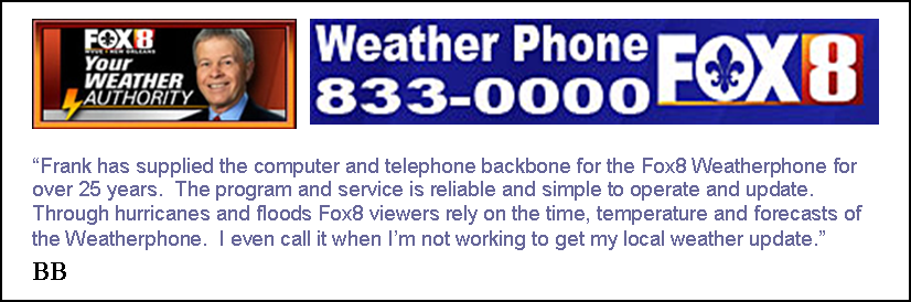 In the new media world of smart phones and “apps” a plain old telephone call seems archaic. Yet, the simplicity of Fox 8 Weatherphone telephone weather service has a devoted public following since 1984. Millions of call have been placed to Bob Breck and his staff of meteorologists over the past 27 years. To this day tens of thousands of callers per month rely on this simple information service. In fact call volume has increased in each of the last three years. Call 833-000 today for an example of our Audiotext programming at work. |