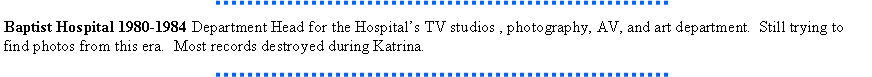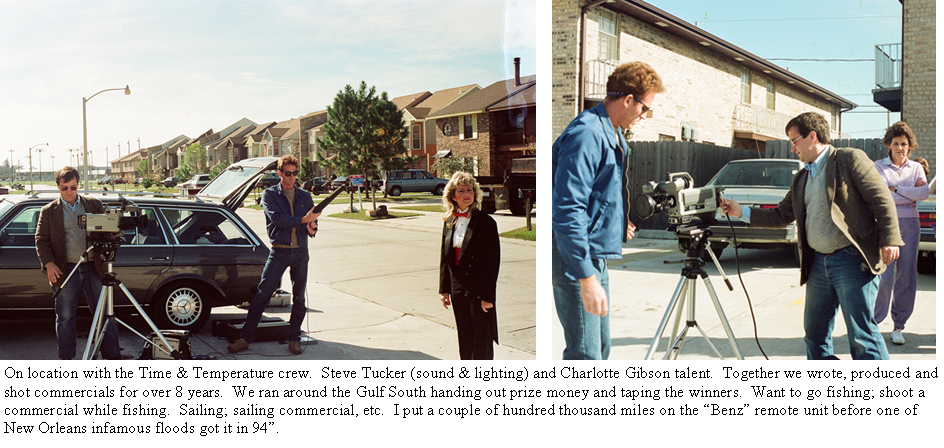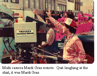 Videodex Productions: I left JKV to establish Videodex Productions with a group of lawyers and the principals of Reco Crane Company. Local commercials, Mardi Gras balls and parades, and offshore oil training programs. Reco Crane represented FMC cranes, the de facto standard for offshore cranes at the time. We produced crane operational programs and basic Coast Guard safety training programs. We spent a lot of time in helicopters, on oil rigs, and in Venus (Louisiana not Italy). Multi camera remotes for telethons and churches became part of the production mix.