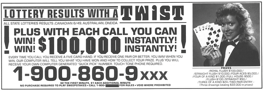 The “Time & Temperature With A Twist” Era: I left Baptist Hospital in 1984, went solo, and established an Audiotext company with a group of cardiologists I met at Baptist. They were looking to invest in something different, like pay phones. I researched payphones, discovered you can not compete against Bellsouth. I did learn about the new “976 & 900” telephone services. We started “Time & Temperature With A Twist” Call 976-1234 for 50 cents, hear the time and temperature, and be dealt a five card hand. If you got 2 pair or better you won cash prizes. (no purchase necessary) There was no lottery in Louisiana at the time and this service’s call volume accelerated to levels no one in the industry could believe. When I met with Phone Programs in New York, the original dial-a- prayer dial-a-joke company, I had to bring telephone bill to verify call volume. We expected an 18 month run for the service, it lasted for 8 years. (Louisiana Lottery started in 1991) |
